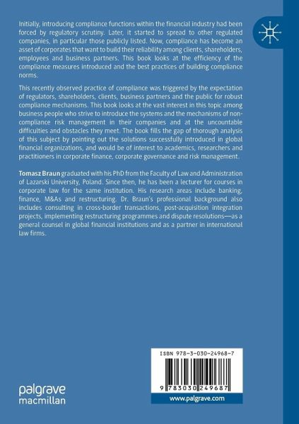 This recently observed practice of compliance was triggered by the expectation of regulators, shareholders, clients, business partners and the public for robust compliance mechanisms. This book looks at the vast interest in this topic among business people who strive to introduce the systems and the mechanisms of non-compliance risk management in their companies and at the uncountable difficulties and obstacles they meet. The book fills the gap of thorough analysis of this subject by pointing out the solutions successfully introduced in global financial organizations, and would be of interest to academics, researchers and practitioners in corporate finance, corporate governance and risk management.