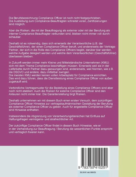 Die Berufsbezeichnung Compliance Officer ist noch nicht festgeschrieben. Die Ausbildung zum Compliance-Beauftragten schreitet voran, Zertifizierungen sind möglich.Aber die Risiken, die mit der Beauftragung als externer oder mit der Berufung als interner Compliance-Beauftragter verbunden sind, bleiben nicht immer voll durchschaubar. Deshalb ist es notwendig, dass sich einerseits der Verantwortliche (z.B. der Geschäftsführer), der einen Compliance-Officer beruft und andererseits der Vertragspartner, der sich in die Rolle des Compliance-Officers begibt, darüber klar werden, welche Aufgaben delegiert werden und welche dem Verantwortlichen Geschäftsführer überlassen bleiben.In Zukunft werden immer mehr Kleine und Mittelständische Unternehmen (KMU) sich mit dem Thema Compliance beschäftigen müssen. Einerseits weil sie in der Lieferkette durch Partner dazu gezwungen sind, andererseits, weil Normen, wie z.B. die DSGVO und andere, dazu mittelbar zwingen.Die meisten KMU werden keinen vollen Arbeitsplatz für Compliance einrichten. Das wird dazu führen, dass die Dienstleistung eines Compliance Officer von außen zugekauft wird. Verbindliche Vertragsmuster für die Bestellung eines Compliance Officers sind aber noch nicht etabliert. Auch die Risiken für externe Compliance Officer sind den Akteuren nicht immer klar. Die Garantenstellung birgt Risiken.Deshalb unternehmen wir mit diesem Buch einen ersten Versuch, dem zukünftigen Compliance Officer Hinweise zur vertragskaufmännischen Gestaltung der Berufung als externer Compliance-Officer zu geben.Insbesondere die Abgrenzung von Verantwortungsbereichen hat Einfluss auf Haftungsfragen vermögens- und strafrechtlicher Art. Der zukünftige Compliance Officer findet in diesem Buch Hinweise, wie er in der Verhandlung zur Beauftragung die wesentlichen Punkte anspricht und vertraglich fixieren kann.