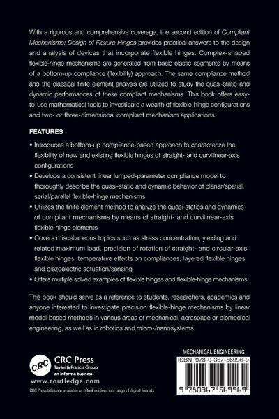 With a rigorous and comprehensive coverage, the second edition of Compliant Mechanisms: Design of Flexure Hinges provides practical answers to the design and analysis of devices that incorporate flexible hinges. Complex-shaped flexible-hinge mechanisms are generated from basic elastic segments by means of a bottom-up compliance (flexibility) approach. The same compliance method and the classical finite element analysis are utilized to study the quasi-static and dynamic performances of these compliant mechanisms. This book offers easy-to-use mathematical tools to investigate a wealth of flexible-hinge configurations and two- or three-dimensional compliant mechanism applications.