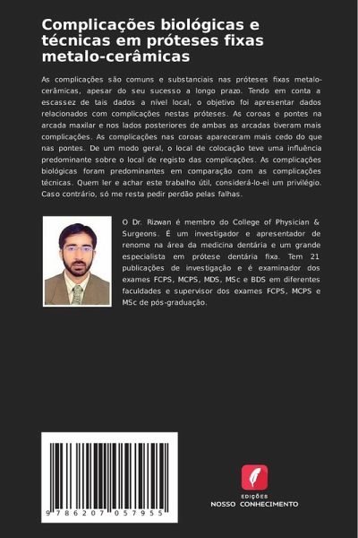 As complicações são comuns e substanciais nas próteses fixas metalo-cerâmicas, apesar do seu sucesso a longo prazo. Tendo em conta a escassez de tais dados a nível local, o objetivo foi apresentar dados relacionados com complicações nestas próteses. As coroas e pontes na arcada maxilar e nos lados posteriores de ambas as arcadas tiveram mais complicações. As complicações nas coroas apareceram mais cedo do que nas pontes. De um modo geral, o local de colocação teve uma influência predominante sobre o local de registo das complicações. As complicações biológicas foram predominantes em comparação com as complicações técnicas. Quem ler e achar este trabalho útil, considerá-lo-ei um privilégio. Caso contrário, só me resta pedir perdão pelas falhas.