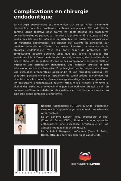 La chirurgie endodontique est une option cruciale parmi les traitements disponibles pour les problèmes dentaires compliqués. Elle est utilisée comme ultime tentative pour sauver les dents lorsque les procédures conventionnelles ne peuvent pas résoudre le problème. En s'attaquant à des problèmes tels que les infections persistantes, les fractures des racines et les variations anatomiques, elle permet aux patients de conserver leur dentition naturelle et d'éviter l'extraction. Toutefois, la réussite de la chirurgie endodontique n'est pas sans poser de problèmes. Des complications peuvent survenir, telles que des lésions nerveuses, des problèmes liés à l'anesthésie locale, des saignements, des troubles de la cicatrisation, etc. La gestion efficace de ces complications est primordiale et nécessite une planification minutieuse, une exécution précise et une intervention rapide si nécessaire. En privilégiant une technique méticuleuse, une évaluation préopératoire approfondie et une formation continue, les praticiens peuvent minimiser l'apparition de complications et optimiser les résultats pour les patients. Grâce à une gestion diligente des complications, les chirurgiens endodontiques peuvent atténuer les risques, préserver la vitalité des dents et promouvoir une guérison optimale, ce qui, en fin de compte, améliore la satisfaction des patients et contribue à la santé et au bien-être bucco-dentaires à long terme.