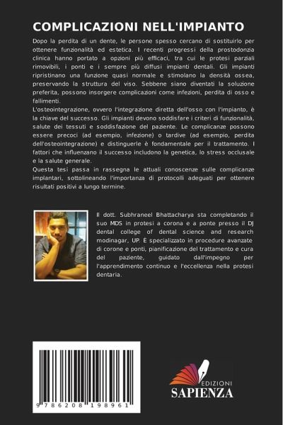 Dopo la perdita di un dente, le persone spesso cercano di sostituirlo per ottenere funzionalità ed estetica. I recenti progressi della prostodonzia clinica hanno portato a opzioni più efficaci, tra cui le protesi parziali rimovibili, i ponti e i sempre più diffusi impianti dentali. Gli impianti ripristinano una funzione quasi normale e stimolano la densità ossea, preservando la struttura del viso. Sebbene siano diventati la soluzione preferita, possono insorgere complicazioni come infezioni, perdita di osso e fallimenti.L'osteointegrazione, ovvero l'integrazione diretta dell'osso con l'impianto, è la chiave del successo. Gli impianti devono soddisfare i criteri di funzionalità, salute dei tessuti e soddisfazione del paziente. Le complicanze possono essere precoci (ad esempio, infezione) o tardive (ad esempio, perdita dell'osteointegrazione) e distinguerle è fondamentale per il trattamento. I fattori che influenzano il successo includono la genetica, lo stress occlusale e la salute generale.Questa tesi passa in rassegna le attuali conoscenze sulle complicanze implantari, sottolineando l'importanza di protocolli adeguati per ottenere risultati positivi a lungo termine.