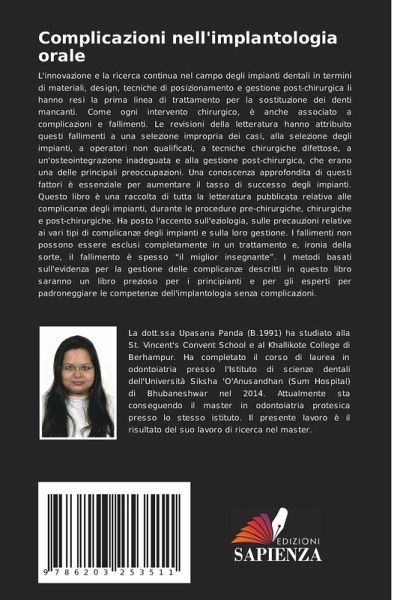 L'innovazione e la ricerca continua nel campo degli impianti dentali in termini di materiali, design, tecniche di posizionamento e gestione post-chirurgica li hanno resi la prima linea di trattamento per la sostituzione dei denti mancanti. Come ogni intervento chirurgico, è anche associato a complicazioni e fallimenti. Le revisioni della letteratura hanno attribuito questi fallimenti a una selezione impropria dei casi, alla selezione degli impianti, a operatori non qualificati, a tecniche chirurgiche difettose, a un'osteointegrazione inadeguata e alla gestione post-chirurgica, che erano una delle principali preoccupazioni. Una conoscenza approfondita di questi fattori è essenziale per aumentare il tasso di successo degli impianti. Questo libro è una raccolta di tutta la letteratura pubblicata relativa alle complicanze degli impianti, durante le procedure pre-chirurgiche, chirurgiche e post-chirurgiche. Ha posto l'accento sull'eziologia, sulle precauzioni relative ai vari tipi di complicanze degli impianti e sulla loro gestione. I fallimenti non possono essere esclusi completamente in un trattamento e, ironia della sorte, il fallimento è spesso "il miglior insegnante". I metodi basati sull'evidenza per la gestione delle complicanze descritti in questo libro saranno un libro prezioso per i principianti e per gli esperti per padroneggiare le competenze dell'implantologia senza complicazioni.