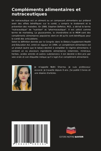 Un nutraceutique est un aliment ou un composant alimentaire qui prétend avoir des effets bénéfiques sur la santé, y compris le traitement et la prévention des maladies. En 1989, Stephen DeFelice, M.D., a dérivé le terme "nutraceutique" de "nutrition" et "pharmaceutique". Il est utilisé comme terme de marketing. La glucosamine, la chondroïtine et le MSM sont des compléments alimentaires populaires dont on dit qu'ils sont bénéfiques pour la santé des articulations.Selon la définition donnée par le Congrès dans le Dietary Supplement Health and Education Act, entré en vigueur en 1994, un complément alimentaire est un produit (autre que le tabac) destiné à compléter le régime alimentaire; il contient un ou plusieurs ingrédients alimentaires (vitamines, minéraux, herbes, acides aminés et autres substances); il est destiné à être pris par voie orale et son étiquette indique qu'il s'agit d'un complément alimentaire.