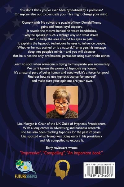You don't think you've ever been hypnotised by a politician? Or anyone else out to persuade you? This might change your mind. Comply with Me solves the puzzle of how Donald Trump gains and keeps loyal support, a conundrum that has stumped professional commentators as well as all those who don’t feel compelled to vote for him. It reveals the motive behind his weird handshakes, why he speaks in such a strange way and even what drives him to keep the area around his eyes so pale. Whether he was trained or is a natural, Trump uses hypnosis techniques to get his message deep into people’s minds – and he is not the only professional persuader using such tricks either. Trump's aim is to achieve unthinking compliance and he does that by using hypnotic confusion techniques which enable him to embed suggestions into his subjects' unconscious minds. He achieves this with individuals as well as with the crowds he addresses. A central part of hypnosis practice is artful suggestion. Donald Trump is a master of the craft. He can imply what he wants to happen without needing to make his commands clear. As a child, like all of us, he absorbed suggestions from his grandfather and parents. The impact of repeatedly being told when young that he was a 'king' and a 'killer' is evident in his adult behaviour. Positive Thinking is a keystone of Trump's self-regard, learning it from the leading exponent, Norman Vincent Peale. who told him he would be 'America's greatest builder'. He also learnt hypnosis, probably when it was fashionable as NLP and he was keen to clinch real estate deals. Hypnotherapists will lie or exaggerate to achieve the aims of their clients. This is ethical if the aim is to help a person give up an addiction or achieve a sense of well-being. Trump and other politicians also recognise that the truth is less important than emotions if they want to convince someone. Their objectives however are not therapeutic. People are often afraid of hypnosis, but they cannot be left ignorant any longer. It’s a natural part of being human; we all go into a trance regularly, when watching TV or doing repetitive tasks. Used well, hypnosis is a force for good. It is also a powerful tool to gain control over others. Some politicians, including those on the far-right, are using hypnosis to sway public opinion. If an argument is going against them, they will use misdirection and exaggeration to divert attention from opposing views. Trump and others who imitate him are experts at using hypnotic confusion to cloud the truth. We must acknowledge the power of hypnosis and make everyone aware of how it works. Readers will learn to spot when someone is trying to manipulate them subliminally and how to defend themselves from it. The book describes how to use hypnotic trance to help yourself, to relax, become acquainted with your unconscious wisdom and make sure your opinions are your own. Lisa Morgan identified what Trump was doing early in his presidency and felt compelled to expose it.