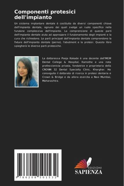 Un sistema implantare dentale è costituito da diversi componenti chiave dell'impianto dentale, ognuno dei quali svolge un ruolo specifico nella funzione complessiva dell'impianto. La comprensione di queste parti dell'impianto dentale aiuta ad apprezzare il funzionamento degli impianti e la cura che richiedono. Le parti principali dell'impianto dentale comprendono la fixture dell'impianto dentale (perno), l'abutment e la protesi. Questo libro spiegherà le diverse parti protesiche.