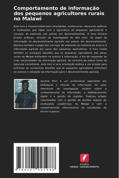 Este livro é imprescindível para estudantes, professores, decisores políticos e instituições que lidam com a agricultura de pequenos agricultores e serviços de extensão nos países em desenvolvimento. O livro fornece provas práticas, através de investigação de alto nível, do papel da informação no desenvolvimento agrícola nos países em desenvolvimento. Destaca também o papel dos serviços de extensão na melhoria do acesso à informação agrícola por parte dos pequenos agricultores. O livro revela também os principais desafios que os pequenos agricultores das zonas rurais do Malawi enfrentam no acesso à informação, a fim de responder às suas necessidades de informação agrícola. Ao contrário de outros livros de natureza semelhante, este livro é uma orientação prática e um projeto para enfrentar os numerosos desafios que os pequenos agricultores enfrentam no acesso e utilização da informação para o desenvolvimento agrícola.