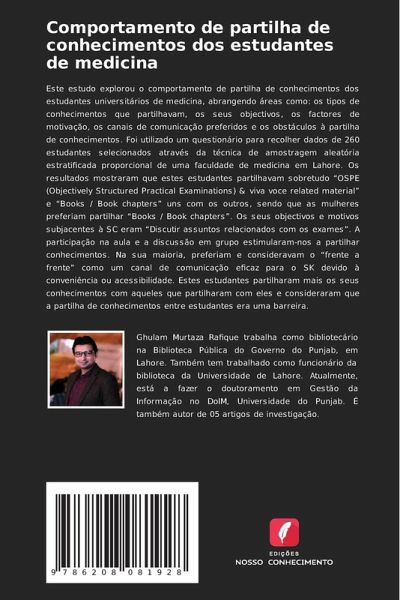 Este estudo explorou o comportamento de partilha de conhecimentos dos estudantes universitários de medicina, abrangendo áreas como: os tipos de conhecimentos que partilhavam, os seus objectivos, os factores de motivação, os canais de comunicação preferidos e os obstáculos à partilha de conhecimentos. Foi utilizado um questionário para recolher dados de 260 estudantes selecionados através da técnica de amostragem aleatória estratificada proporcional de uma faculdade de medicina em Lahore. Os resultados mostraram que estes estudantes partilhavam sobretudo ¿OSPE (Objectively Structured Practical Examinations) & viva voce related material¿ e ¿Books / Book chapters¿ uns com os outros, sendo que as mulheres preferiam partilhar ¿Books / Book chapters¿. Os seus objectivos e motivos subjacentes à SC eram ¿Discutir assuntos relacionados com os exames¿. A participação na aula e a discussão em grupo estimularam-nos a partilhar conhecimentos. Na sua maioria, preferiam e consideravam o ¿frente a frente¿ como um canal de comunicação eficaz para o SK devido à conveniência ou acessibilidade. Estes estudantes partilharam mais os seus conhecimentos com aqueles que partilharam com eles e consideraram que a partilha de conhecimentos entre estudantes era uma barreira.