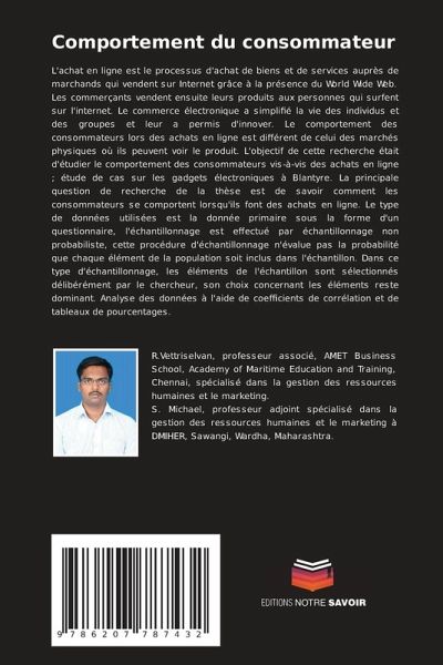 L'achat en ligne est le processus d'achat de biens et de services auprès de marchands qui vendent sur Internet grâce à la présence du World Wide Web. Les commerçants vendent ensuite leurs produits aux personnes qui surfent sur l'internet. Le commerce électronique a simplifié la vie des individus et des groupes et leur a permis d'innover. Le comportement des consommateurs lors des achats en ligne est différent de celui des marchés physiques où ils peuvent voir le produit. L'objectif de cette recherche était d'étudier le comportement des consommateurs vis-à-vis des achats en ligne ; étude de cas sur les gadgets électroniques à Blantyre. La principale question de recherche de la thèse est de savoir comment les consommateurs se comportent lorsqu'ils font des achats en ligne. Le type de données utilisées est la donnée primaire sous la forme d'un questionnaire, l'échantillonnage est effectué par échantillonnage non probabiliste, cette procédure d'échantillonnage n'évalue pas la probabilité que chaque élément de la population soit inclus dans l'échantillon. Dans ce type d'échantillonnage, les éléments de l'échantillon sont sélectionnés délibérément par le chercheur, son choix concernant les éléments reste dominant. Analyse des données à l'aide de coefficients de corrélation et de tableaux de pourcentages.