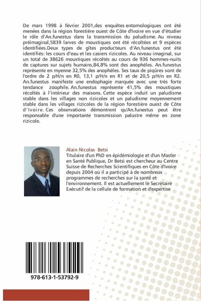 De mars 1998 à février 2001,des enquêtes entomologiques ont été menées dans la région forestière ouest de Côte d'Ivoire en vue d'étudier le rôle d'An.funestus dans la transmission du paludisme. Au niveau préimaginal,5839 larves de moustiques ont été récoltées et 9 espèces identifiées.Deux types de gîtes producteurs d'An.funestus ont été identifiés: les cours d'eau et les casiers rizicoles. Au niveau imaginal, sur un total de 38626 moustiques récoltés au cours de 936 hommes-nuits de captures sur sujets humains,84,8% sont des anophèles. An.funestus représente en myenne 32,5% des anophèles. Ses taux de piqûres sont de l'ordre de 2 p/H/n en R0, 13,1 p/H/n en R1 et de 20,5 p/H/n en R2. An.funestus manifeste une endophagie marquée avec une très forte tendance zoophile. An.funestus représente 41,5% des moustiques récoltés à l'intérieur des maisons. Cette espèce induit un paludisme stable dans les villages non rizicoles et un paludisme moyennement stable dans les villages rizicoles de la région forestière ouest de Côte d'Ivoire. Ces observations démontrent qu'An.funestus peut être responsable d'une importante transmission palustre même en zone rizicole.