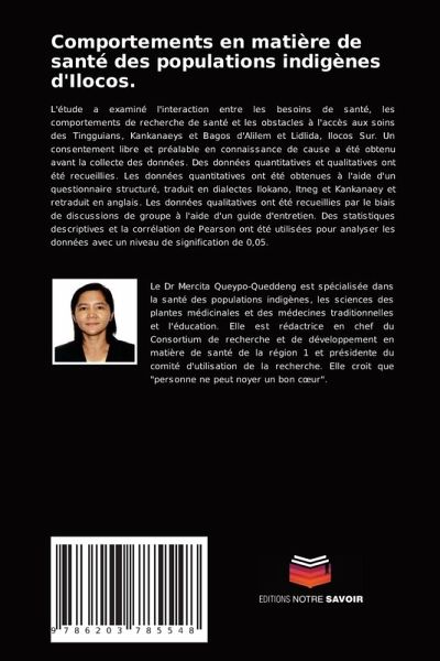 L'étude a examiné l'interaction entre les besoins de santé, les comportements de recherche de santé et les obstacles à l'accès aux soins des Tingguians, Kankanaeys et Bagos d'Alilem et Lidlida, Ilocos Sur. Un consentement libre et préalable en connaissance de cause a été obtenu avant la collecte des données. Des données quantitatives et qualitatives ont été recueillies. Les données quantitatives ont été obtenues à l'aide d'un questionnaire structuré, traduit en dialectes Ilokano, Itneg et Kankanaey et retraduit en anglais. Les données qualitatives ont été recueillies par le biais de discussions de groupe à l'aide d'un guide d'entretien. Des statistiques descriptives et la corrélation de Pearson ont été utilisées pour analyser les données avec un niveau de signification de 0,05.