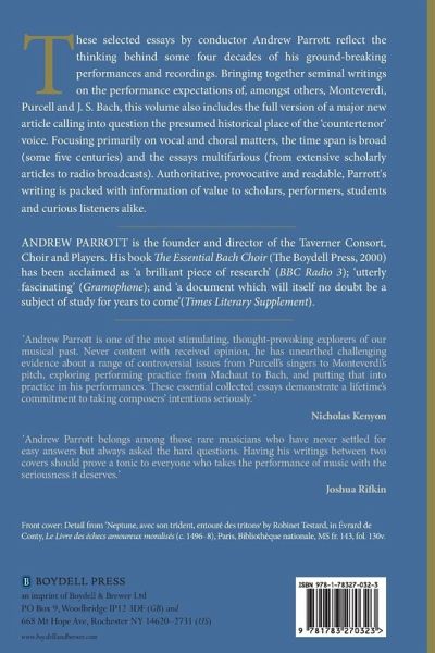These selected essays by conductor Andrew Parrott reflect the thinking behind some four decades of his ground-breaking performances and recordings. Bringing together seminal writings on the performance expectations of, amongst others, Monteverdi, Purcell and J. S. Bach, this volume also includes the full version of a major new article calling into question the presumed historical place of the 'countertenor' voice. Focusing primarily on vocal and choral matters, the time span is broad (some five centuries) and the essays multifarious (from extensive scholarly articles to radio broadcasts). Authoritative, provocative and readable, Parrott's writing is packed with information of value to scholars, performers, students and curious listeners alike. ANDREW PARROTT is the founder and director of the Taverner Consort, Choir and Players. His book The Essential Bach Choir (The Boydell Press, 2000) has been acclaimed as 'a brilliant piece of research' (BBC Radio 3); 'utterly fascinating' (Gramophone); and 'a document which will itself no doubt be a subject of study for years to come' (Times Literary Supplement).