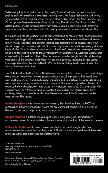 With nearly 400 scores to his credit, Ennio Morricone is one of the most prolific and influential film composers working today. In Composing for the Cinema, Morricone and musicologist Sergio Miceli present a series of lectures on the composition and analysis of film music. Adapted from several lectures and seminars, these lessons show how sound design can be analyzed and offer a variety of musical solutions to many different kinds of film. Drawing upon scores by himself and others, the composer also provides insight into his relationships with many of the directors with whom he has collaborated, including Sergio Leone, Giuseppe Tornatore, Franco Zeffirelli, Warren Beatty, Ridley Scott, Roland Joffé, the Taviani Brothers, and others. Delivered in a conversational mode that is both comprehensible and interesting, this groundbreaking work intertwines analysis with practical details of film music composition.