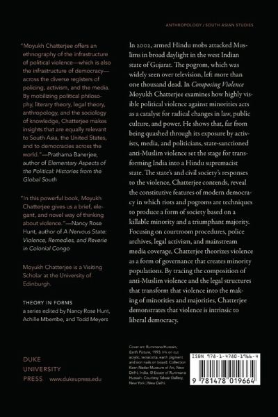 In 2002, armed Hindu mobs attacked Muslims in broad daylight in the west Indian state of Gujarat. The pogrom, which was widely seen over television, left more than one thousand dead. In Composing Violence Moyukh Chatterjee examines how highly visible political violence against minorities acts as a catalyst for radical changes in law, public culture, and power. He shows that, far from being quashed through its exposure by activists, media, and politicians, state-sanctioned anti-Muslim violence set the stage for transforming India into a Hindu supremacist state. The state's and civil society's responses to the violence, Chatterjee contends, reveal the constitutive features of modern democracy in which riots and pogroms are techniques to produce a form of society based on a killable minority and a triumphant majority. Focusing on courtroom procedures, police archives, legal activism, and mainstream media coverage, Chatterjee theorizes violence as a form of governance that creates minority populations. By tracing the composition of anti-Muslim violence and the legal structures that transform that violence into the making of minorities and majorities, Chatterjee demonstrates that violence is intrinsic to liberal democracy.