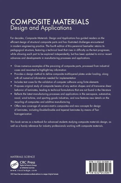 For decades, Composite Materials: Design and Applications has guided readers on the efficient design of structural composite parts and has illustrated challenges encountered in modern engineering practice. The Fourth Edition of this perennial best-seller, now including a foreword by Professor Stephen Tsai, retains its pedagogical structure, featuring a technical level that rises in difficulty as the text progresses, while allowing each part to be explored independently, but has been updated to mirror recent advances and developments in manufacturing processes and applications. Gives numerous examples of the pre-sizing of composite parts, processed from industrial cases and reworked to highlight key informationProvides a design method to define composite multilayered plates under loading, along with all numerical information needed for implementationIncludes test cases for the validation of computer software using finite elementsProposes original study of composite beams ofany section shapes and of transverse shear behavior of laminates, leading to technical formulations that are not found in the literatureReflects the latest manufacturing processes and applications in the aerospace, automotive, naval, wind turbine, and sporting goods industries, and now features new details on the recycling of composites and additive manufacturingOffers new coverage of ceramic-matrix composites and new concepts for design of laminates, including Double-Double and tapered laminates by means of Tsai homogenization This book serves as a textbook for advanced students studying composite materials design, as well as a handy reference for industry professionals working with composite materials.