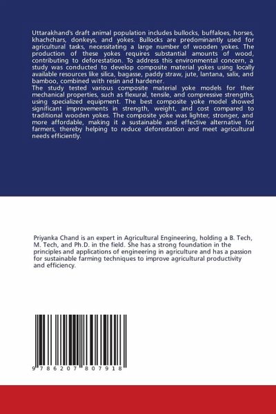 Uttarakhand's draft animal population includes bullocks, buffaloes, horses, khachchars, donkeys, and yokes. Bullocks are predominantly used for agricultural tasks, necessitating a large number of wooden yokes. The production of these yokes requires substantial amounts of wood, contributing to deforestation. To address this environmental concern, a study was conducted to develop composite material yokes using locally available resources like silica, bagasse, paddy straw, jute, lantana, salix, and bamboo, combined with resin and hardener.The study tested various composite material yoke models for their mechanical properties, such as flexural, tensile, and compressive strengths, using specialized equipment. The best composite yoke model showed significant improvements in strength, weight, and cost compared to traditional wooden yokes. The composite yoke was lighter, stronger, and more affordable, making it a sustainable and effective alternative for farmers, thereby helping to reduce deforestation and meet agricultural needs efficiently.