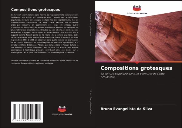 Ce livre est une immersion dans l'oeuvre de l'expressionniste bahianais Sante Scaldaferri. Un artiste qui s'immerge dans l'univers des manifestations populaires, de leurs personnages et objets les plus représentatifs, face au bouleversement institutionnel de 1964. Sante exprime une esthétique grotesque populaire, en positionnant ses coups de pinceau autour d'expériences dépourvues de normes socialement établies, en reléguant au plan matériel des circonstances attribuées au plan céleste, de sorte que des expériences magiques, fantastiques et extraordinaires font irruption sur le support comme faisant partie de la réalité de la culture populaire. Cette recherche examine trois phases de la peinture de Sante Scaldaferri, couvrant la période de 1964 à 1988, en observant dans quelle mesure les expressions de la culture populaire sont accompagnées de réactions symboliques à la dictature militaire brésilienne. "Grotesque Compositions : Popular Culture in the Paintings of Sante Scaldaferri" est un livre qui apporte une analyse sociologique à l'esthétique picturale, contribuant ainsi aux études sur la sociologie de l'art et, plus spécifiquement, sur la sociologie de la peinture.