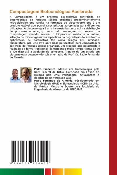 A Compostagem é um processo bio-oxidativo controlado de decomposição de resíduos sólidos orgânicos predominantemente microbiológico que resulta na formação do biocomposto que é um produto estável que possui características apropriadas para diferentes utilizações. A biotecnologia é uma farameta bastante útil na viabilização de processos e serviços, tendo sido empregue no processo de compostagem visando acelerar o bioprocesso mediante o cultivo, selecção de micro-organismos específicos na degradação do substrato e optimização de parâmetros tais como relação C/N, umidade, temperatura, pH. Este livro abre boas perspectivas para compostagem acelerada de resíduos sólidos orgânicos, um processo que geralmente é realizado de forma tradicional, demandando muito tempo (cerca de 90 a 120 dias) até a aquisição do composto. Trata-se de um estudo em biotecnologia desenvolvido sob orientação de Prof. Dr. Paulo Fernando de Almeida.