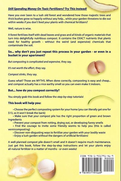 Still Spending Money On Toxic Fertilizers? Try This Instead! Have you ever been to a lush old forest and wondered how those majestic trees and thick bushes grow so happily without any help... while your garden threatens to die out within weeks if you don't feed your plants with chemical fertilizers? Well, nature is wise. A forest fertilizes itself with dead leaves and grass and all kinds of organic materials that turn into delightfully nutritious compost. It contains the EXACT nutrients that plants need for healthy growth - without the weird (and expensive) chemicals that contaminate the soil. So... why don't you just repeat this process in your garden - or even in a bucket in your apartment? But composting is complicated and expensive, they say. It's not worth the effort, they say. Compost stinks, they say. Guess what? Those are MYTHS. When done correctly, composting is easy and cheap... and compost actually has a nice earthy smell so you can even make it indoors. But... how do you compost correctly? You simply grab this book and follow the step-by-step tutorials!This book will help you:Choose the perfect composting system for your home (you can literally get one for $13, so it won't break the bank) Make sure that your compost pile has the right proportion of green and brown ingredients Prevent your compost from rotting, drying out, or developing funny smells Find the courage to invite some friendly worms to help you (this is called vermicomposting) Discover non-disgusting ways to fertilize your garden with your bodily waste Enjoy a lush garden without the dangers of artificial fertilizers! A well-planned compost pile doesn't smell and it doesn't require much maintenance. Just get this book, follow the step-by-step instructions and let your plants enjoy all-natural fertilizer in a matter of months - or even weeks!