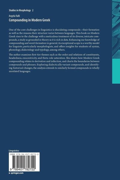 One of the core challenges in linguistics is elucidating compounds-their formation as well as the reasons their structure varies between languages. This book on Modern Greek rises to the challenge with a meticulous treatment of its diverse, intricate compounds, a study as grounded in theory as it is rich in data. Enhancing our knowledge of compounding and word-formation in general, its exceptional scope is a worthy model for linguists, particularly morphologists, and offers insights for students of syntax, phonology, dialectology and typology, among others.The author examines first-tier themes such as the order and relations of constituents, headedness, exocentricity, and theta-role saturation. She shows how Modern Greek compounding relates to derivation and inflection, and charts the boundaries between compounds and phrases. Exploring dialectically variant compounds, and identifying historical changes, the analysis extends to similarly formed compounds in wholly unrelated languages.