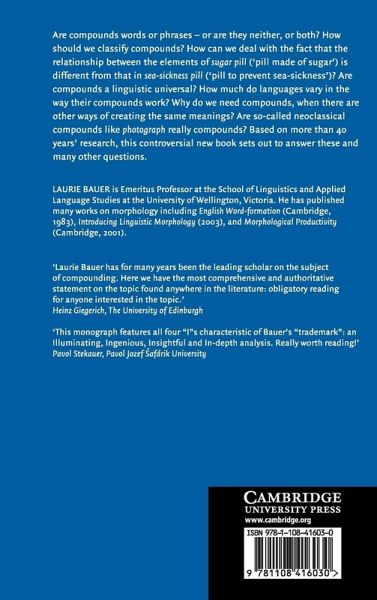 Are compounds words or phrases - or are they neither or both? How should we classify compounds? How can we deal with the fact that the relationship between the elements of sugar pill ('pill made of sugar') is different from that in sea-sickness pill ('pill to prevent sea-sickness')? Are compounds a linguistic universal? How much do languages vary in the way their compounds work? Why do we need compounds, when there are other ways of creating the same meanings? Are so-called neoclassical compounds like photograph really compounds? Based on more than forty years' research, this controversial new book sets out to answer these and many other questions.