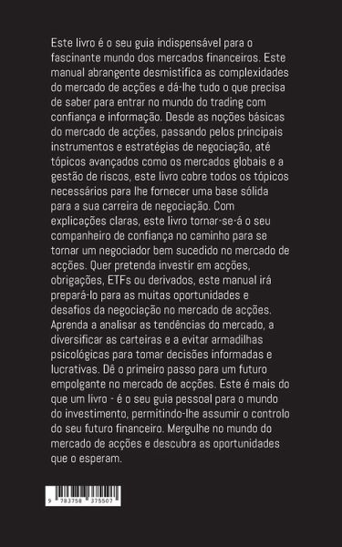 Este livro é o seu guia indispensável para o fascinante mundo dos mercados financeiros. Este manual abrangente desmistifica as complexidades do mercado de acções e dá-lhe tudo o que precisa de saber para entrar no mundo do trading com confiança e informação. Desde as noções básicas do mercado de acções, passando pelos principais instrumentos e estratégias de negociação, até tópicos avançados como os mercados globais e a gestão de riscos, este livro cobre todos os tópicos necessários para lhe fornecer uma base sólida para a sua carreira de negociação. Com explicações claras, este livro tornar-se-á o seu companheiro de confiança no caminho para se tornar um negociador bem sucedido no mercado de acções. Quer pretenda investir em acções, obrigações, ETFs ou derivados, este manual irá prepará-lo para as muitas oportunidades e desafios da negociação no mercado de acções. Aprenda a analisar as tendências do mercado, a diversificar as carteiras e a evitar armadilhas psicológicas para tomar decisões informadas e lucrativas. Dê o primeiro passo para um futuro empolgante no mercado de acções. Este é mais do que um livro - é o seu guia pessoal para o mundo do investimento, permitindo-lhe assumir o controlo do seu futuro financeiro. Mergulhe no mundo do mercado de acções e descubra as oportunidades que o esperam.