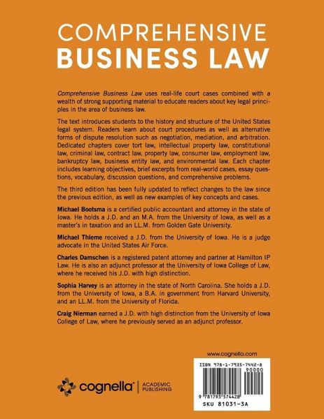 Comprehensive Business Law uses real-life court cases combined with a wealth of strong supporting material to educate readers about key legal principles in the area of business law. The text introduces students to the history and structure of the United States legal system. Readers learn about court procedures as well as alternative forms of dispute resolution such as negotiation, mediation, and arbitration. Dedicated chapters cover tort law, intellectual property law, constitutional law, criminal law, contract law, property law, consumer law, employment law, bankruptcy law, business entity law, and environmental law. Each chapter includes learning objectives, brief excerpts from real-world cases, essay questions, vocabulary, discussion questions, and comprehensive problems. The third edition has been fully updated to reflect changes to the law since the previous edition, as well as new examples of key concepts and cases. Michael Bootsma is a certified public accountant and attorney in the state of Iowa. He holds a J.D. and an M.A. from the University of Iowa, as well as a master's in taxation and an LL.M. from Golden Gate University. He is the dean's teaching fellow at the Ivy College of Business at Iowa State University. Michael Thieme received a J.D. from the University of Iowa. He is a judge advocate in the United States Air Force. He previously served as an assistant professor of law at the United States Air Force Academy. Charles Damschen is a registered patent attorney and partner at Hamilton IP Law. He is also an adjunct professor at the University of Iowa College of Law, where he received his J.D. with high distinction. Sophia Harvey is an attorney in the state of North Carolina. She holds a J.D. from the University of Iowa, a B.A. in government from Harvard University, and an LL.M. from the University of Florida. Craig Nierman earned a J.D. with high distinction from the University of Iowa College of Law, where he previously served as an adjunct professor. He practices insurance law in Iowa and serves nationally as an expert witness and consultant in insurance litigation.
