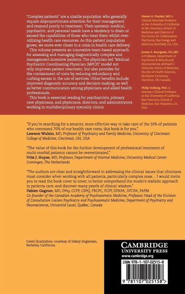'Complex patients' are a sizeable population who generally require disproportionate attention for their management and respond poorly to treatment. Their systemic medical, psychiatric and personal needs have a tendency to drain or exceed the capabilities of those who treat them whilst overutilizing health care resources. As this patient population grows, we move ever closer to a crisis in health care delivery. This volume presents an innovative team-based approach for assessing and managing diagnostically complex and management intensive patients. The physician-led 'Medical-Psychiatric…mehr