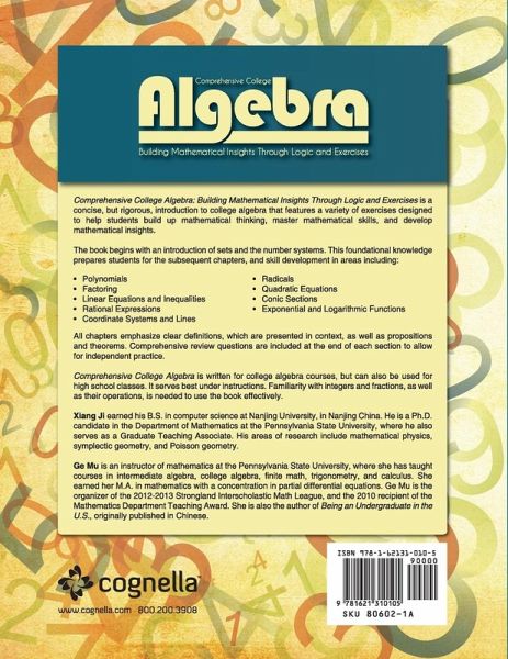 Comprehensive College Algebra: Building Mathematical Insights Through Logic and Exercises is a concise, but rigorous, introduction to college algebra that features a variety of exercises designed to help students build up mathematical thinking, master mathematical skills, and develop mathematical insights. The book begins with an introduction of sets and the number systems. This foundational knowledge prepares students for the subsequent chapters, and skill development in areas including: Polynomials; Factoring; Linear Equations and Inequalities; Rational Expressions; Coordinate Systems and Lines; Radicals; Quadratic Equations; Conic Sections; and Exponential and Logarithmic Functions. All chapters emphasize clear definitions, which are presented in context, as well as propositions and theorems. Comprehensive review questions are included at the end of the book to allow for independent practice. Xiang Ji earned his B.S. in computer science at Nanjing University, in Nanjing China. He is a Ph.D. candidate in the Department of Mathematics at the Pennsylvania State University, where he also serves as a Graduate Teaching Associate. His areas of research include mathematical physics, symplectic geometry, and Poisson geometry. Ge Mu is an instructor of mathematics at the Pennsylvania State University, where she has taught courses in intermediate algebra, college algebra, finite math, trigonometry, and calculus. She earned her M.A. in mathematics with a concentration in partial differential equations. Ge Mu is the organizer of the 2012-2013 Strongland Interscholastic Math League, and the 2010 recipient of the Mathematics Department Teaching Award. She is also the author of Being an Undergraduate in the U.S., originally published in Chinese.