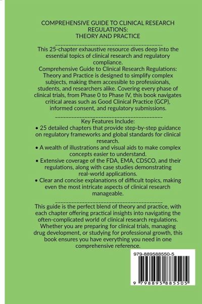 COMPREHENSIVE GUIDE TO CLINICAL RESEARCH REGULATIONS: THEORY AND PRACTICE This 25-chapter exhaustive resource dives deep into the essential topics of clinical research and regulatory compliance. Comprehensive Guide to Clinical Research Regulations: Theory and Practice is designed to simplify complex subjects, making them accessible to professionals, students, and researchers alike. Covering every phase of clinical trials, from Phase 0 to Phase IV, this book navigates critical areas such as Good Clinical Practice (GCP), informed consent, and regulatory submissions. Key Features Include: 25 detailed chapters that provide step-by-step guidance on regulatory frameworks and global standards for clinical research. A wealth of illustrations and visual aids to make complex concepts easier to understand. Extensive coverage of the FDA, EMA, CDSCO, and their regulations, along with case studies demonstrating real-world applications. Clear and concise explanations of difficult topics, making even the most intricate aspects of clinical research manageable. This guide is the perfect blend of theory and practice, with each chapter offering practical insights into navigating the often-complicated world of clinical research regulations. Whether you are preparing for clinical trials, managing drug development, or studying for professional growth, this book ensures you have everything you need in one comprehensive reference.