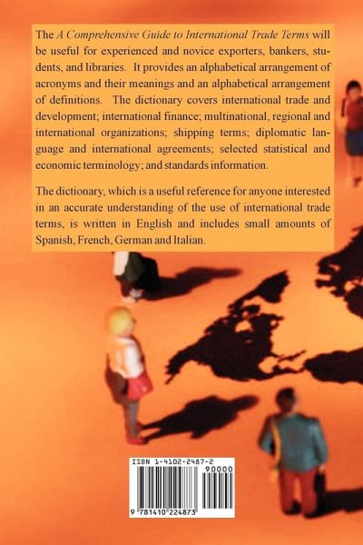 The A Comprehensive Guide to International Trade Terms will be useful for experienced and novice exporters, bankers, students, and libraries. It provides an alphabetical arrangement of acronyms and their meanings and an alphabetical arrangement of definitions. The dictionary covers international trade and development; international finance; multinational, regional and international organizations; shipping terms; diplomatic language and international agreements; selected statistical and economic terminology; and standards information. The dictionary, which is a useful reference for anyone interested in an accurate understanding of the use of international trade terms, is written in English and includes small amounts of Spanish, French, German and Italian.