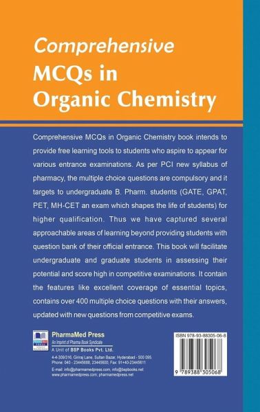 Comprehensive MCQs in Organic Chemistry book intends to provide free learning tools to students who aspire to appear for various entrance examinations. As per PCI new syllabus of pharmacy, the multiple choice questions are compulsory and it targets to undergraduate B. Pharm. students (GATE, GPAT, PET, MH-CET an exam which shapes the life of students) for higher qualification. Thus we have captured several approachable areas of learning beyond providing students with question bank of their official entrance. This book will facilitate undergraduate and graduate students in assessing their potential and score high in competitive examinations. It contain the features like excellent coverage of essential topics, contains over 400 multiple choice questions with their answers, updated with new questions from competitive exams. Contents: 1. Atoms, Molecules and Chemical Bonding 2. Molecular Structure and Shapes of Organic Molecules 3. Organic Compounds 4. Conformation and Strain in Molecules 5. Conjugation and Aromaticity 6. Acids and Bases 7. Organic Reactions and Concept of Mechanism 8. Nucleophillic Addition Reactions 9. Nucleophillic Substitution Reactions 10. Reactions of Carbonyl Compound 11. Haloalkanes 12. Alcohols, Ethers, Thiols, Sulfides and Amines 13. Alkenes and Alkynes 14. Electrophillic Aromatic Substitution 15. Polycyclic and Heterocyclic Aromatic Compounds 16. Pericyclic Reactions 17. Rearrangement Reactions 18. Organic Synthesis 19. Chemistry of Biomolecules 20. Structural Determination of Organic Compounds 21. Stereochemistry