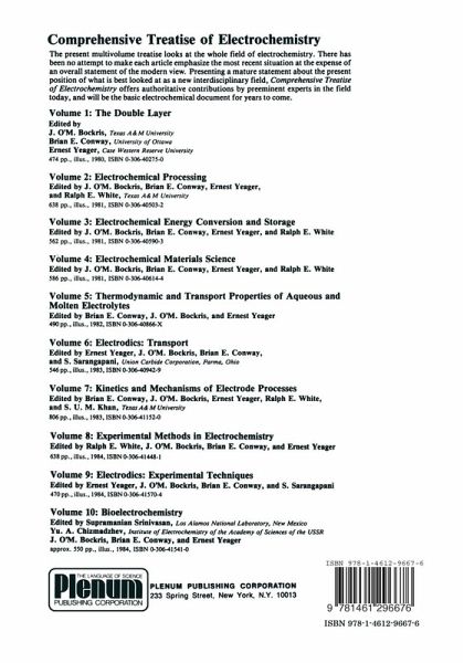It is now time for a comprehensive treatise to look at the whole field of electrochemistry. The present treatise was conceived in 1974, and the earliest invitations to authors for contributions were made in 1975. The completion of the early volumes has been delayed by various factors. There has been no attempt to make each article emphasize the most recent situation at the expense of an overall statement of the modern view. This treatise is not a collection of articles from Recent Advances in Electrochemistry or Modern Aspects of Electrochemistry. It is an attempt at making a mature statement about the present position in the vast area of what is best looked at as a new interdisciplinary field. Texas A & M University J. O'M. Bockris University of Ottawa B. E. Conway Case Western Reserve University Ernest Yeager Texas A & M University Ralph E. White Preface to Volume 8 Experimental methods in electrochemistry are becoming more diverse. This volume describes many of the new techniques that are being used as well as some of the well-established techniques. It begins with two chapters (1 and 2) on electronic instrumentation and methods for utilization of microcomputers for experimental data acquisition and reduction. Next, two chapters (3 and 4) on classical methods of electrochemical analysis are presented: ion selective electrodes and polarography.