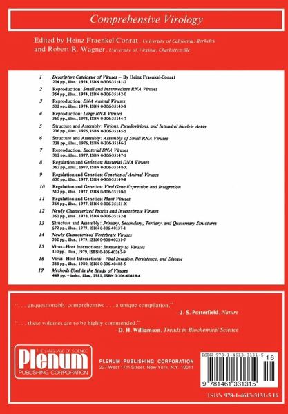 The time seems ripe for a critical compendium of that segment of the biological universe we call viruses. Virology, as a science, having passed only recently through its descriptive phase of naming and num bering, has probably reached that stage at which relatively few new truly new-viruses will be discovered. Triggered by the intellectual probes and techniques of molecular biology, genetics, biochemical cytology, and high resolution microscopy and spectroscopy, the field has experienced a genuine information explosion. Few serious attempts have been made to chronicle these events. This comprehensive series, which will comprise some 6000 pages in a total of about 18 volumes, represents a commitment by a large group of active investigators to analyze, digest, and expostulate on the great mass of data relating to viruses, much of which is now amorphous and disjointed, and scattered throughout a wide literature. In this way, we hope to place the entire field in perspective, and to develop an invalua ble reference and sourcebook for researchers and students at all levels. This series is designed as a continuum that can be entered anywhere, but which also provides a logical progression of developing facts and integrated concepts.