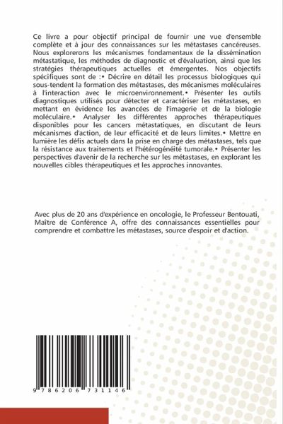 Ce livre a pour objectif principal de fournir une vue d'ensemble complète et à jour des connaissances sur les métastases cancéreuses. Nous explorerons les mécanismes fondamentaux de la dissémination métastatique, les méthodes de diagnostic et d'évaluation, ainsi que les stratégies thérapeutiques actuelles et émergentes. Nos objectifs spécifiques sont de :- Décrire en détail les processus biologiques qui sous-tendent la formation des métastases, des mécanismes moléculaires à l'interaction avec le microenvironnement.- Présenter les outils diagnostiques utilisés pour détecter et caractériser les métastases, en mettant en évidence les avancées de l'imagerie et de la biologie moléculaire.- Analyser les différentes approches thérapeutiques disponibles pour les cancers métastatiques, en discutant de leurs mécanismes d'action, de leur efficacité et de leurs limites.- Mettre en lumière les défis actuels dans la prise en charge des métastases, tels que la résistance aux traitements et l'hétérogénéité tumorale.- Présenter les perspectives d'avenir de la recherche sur les métastases, en explorant les nouvelles cibles thérapeutiques et les approches innovantes.