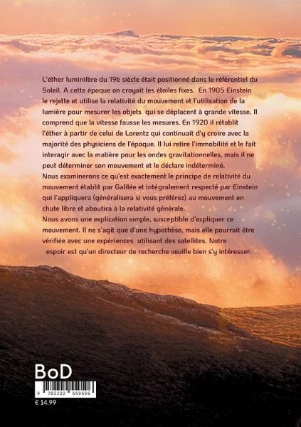 L'éther luminifère du 19è siècle était positionné dans le référentiel du Soleil. A cette époque on croyait les étoiles fixes. En 1905 Einstein le rejette et utilise la relativité du mouvement et l'utilisation de la lumière pour mesurer les objets qui se déplacent à grande vitesse. Il comprend que la vitesse fausse les mesures. En 1920 il rétablit l'éther à partir de celui de Lorentz qui continuait d'y croire avec la majorité des physiciens de l'époque. Il lui retire l'immobilité et le fait interagir avec la matière pour les ondes gravitationnelles, mais il ne peut déterminer son mouvement et le déclare indéterminé. Nous examinerons ce qu'est exactement le principe de relativité du mouvement établit par Galilée et intégralement respecté par Einstein qui l'appliquera (généralisera si vous préférez) au mouvement en chute libre et aboutira à la relativité générale. Nous avons une explication simple, susceptible d'expliquer ce mouvement. Il ne s'agit que d'une hypothèse, mais elle pourrait être vérifiée avec une expériences utilisant des satellites. Notre espoir est qu'un directeur de recherche veuille bien s'y intéresser.