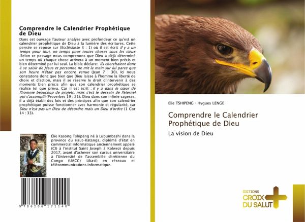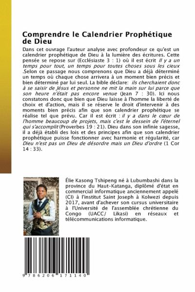 Dans cet ouvrage l'auteur analyse avec profondeur ce qu'est un calendrier prophétique de Dieu à la lumière des écritures. Cette pensée se repose sur (Ecclésiaste 3 : 1) où il est écrit Il y a un temps pour tout, un temps pour toutes choses sous les cieux .Selon ce passage nous comprenons que Dieu a déjà déterminé un temps où chaque chose arrivera à un moment bien précis et bien déterminé par lui seul. La bible déclare: ils cherchaient donc à se saisir de Jésus et personne ne mit la main sur lui parce que son heure n'était pas encore venue (Jean 7 : 30). Ici nous constatons donc que bien que Dieu laisse à l'homme la liberté de choix et d'action, mais il se réserve le droit d'intervenir à des moments bien précis afin que son calendrier prophétique se réalise tel que prévu. Car il est écrit : il y a dans le coeur de l'homme beaucoup de projets, mais c'est le dessein de l'éternel qui s'accomplit (Proverbes 19 : 21). Dieu dans son infinie sagesse, il a déjà établi des lois et des principes afin que son calendrier prophétique puisse fonctionner avec harmonie et régularité, car Dieu n'est pas un Dieu de désordre mais un Dieu d'ordre (1 Cor 14 : 33).