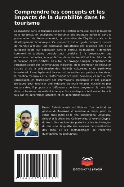 La durabilité dans le tourisme explore la relation complexe entre le tourisme et la durabilité, en soulignant l'importance des pratiques durables dans la préservation de l'environnement, la promotion de l'équité sociale et le développement économique. Ce manuscrit est un guide complet structuré de manière à fournir une exploration approfondie des principes clés de la durabilité et de leur application dans le secteur du tourisme. Il démontre comment le tourisme durable peut conduire à la préservation des ressources naturelles, à la protection de la biodiversité et à la réduction de la pollution et des déchets. En outre, cet ouvrage souligne l'importance de l'autonomisation des communautés indigènes, de la promotion de l'inclusion sociale et de la préservation des identités culturelles et du patrimoine immatériel. Il met également l'accent sur le soutien aux petites entreprises, la création d'emplois et le renforcement des liens économiques locaux. Par conséquent, en fournissant des informations précieuses et des conseils pratiques pour favoriser une industrie du tourisme plus durable et plus responsable, il propose aux défenseurs de faire progresser la durabilité dans le tourisme en veillant à ce que les avantages soient ressentis à la fois par les générations actuelles et les générations futures.