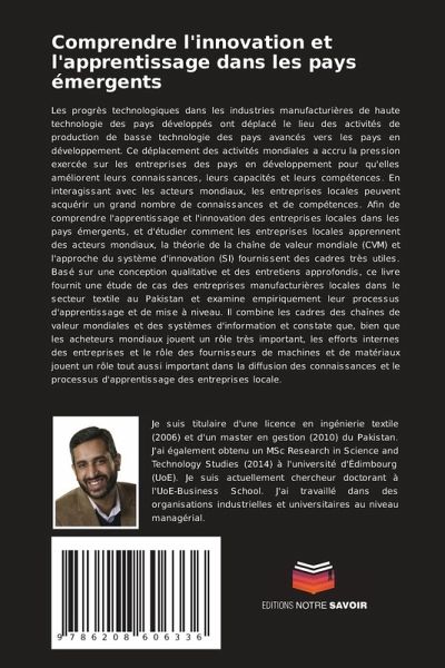 Les progrès technologiques dans les industries manufacturières de haute technologie des pays développés ont déplacé le lieu des activités de production de basse technologie des pays avancés vers les pays en développement. Ce déplacement des activités mondiales a accru la pression exercée sur les entreprises des pays en développement pour qu'elles améliorent leurs connaissances, leurs capacités et leurs compétences. En interagissant avec les acteurs mondiaux, les entreprises locales peuvent acquérir un grand nombre de connaissances et de compétences. Afin de comprendre l'apprentissage et l'innovation des entreprises locales dans les pays émergents, et d'étudier comment les entreprises locales apprennent des acteurs mondiaux, la théorie de la chaîne de valeur mondiale (CVM) et l'approche du système d'innovation (SI) fournissent des cadres très utiles. Basé sur une conception qualitative et des entretiens approfondis, ce livre fournit une étude de cas des entreprises manufacturières locales dans le secteur textile au Pakistan et examine empiriquement leur processus d'apprentissage et de mise à niveau. Il combine les cadres des chaînes de valeur mondiales et des systèmes d'information et constate que, bien que les acheteurs mondiaux jouent un rôle très important, les efforts internes des entreprises et le rôle des fournisseurs de machines et de matériaux jouent un rôle tout aussi important dans la diffusion des connaissances et le processus d'apprentissage des entreprises locale.