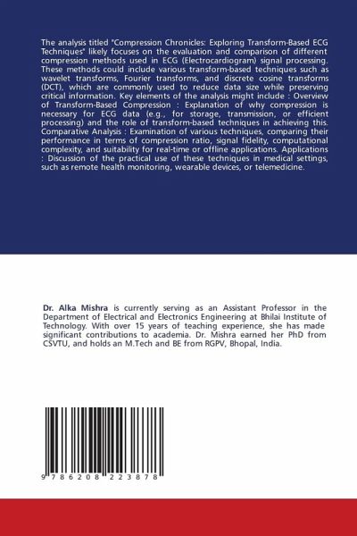 The analysis titled "Compression Chronicles: Exploring Transform-Based ECG Techniques" likely focuses on the evaluation and comparison of different compression methods used in ECG (Electrocardiogram) signal processing. These methods could include various transform-based techniques such as wavelet transforms, Fourier transforms, and discrete cosine transforms (DCT), which are commonly used to reduce data size while preserving critical information. Key elements of the analysis might include : Overview of Transform-Based Compression : Explanation of why compression is necessary for ECG data (e.g., for storage, transmission, or efficient processing) and the role of transform-based techniques in achieving this. Comparative Analysis : Examination of various techniques, comparing their performance in terms of compression ratio, signal fidelity, computational complexity, and suitability for real-time or offline applications. Applications : Discussion of the practical use of these techniques in medical settings, such as remote health monitoring, wearable devices, or telemedicine.