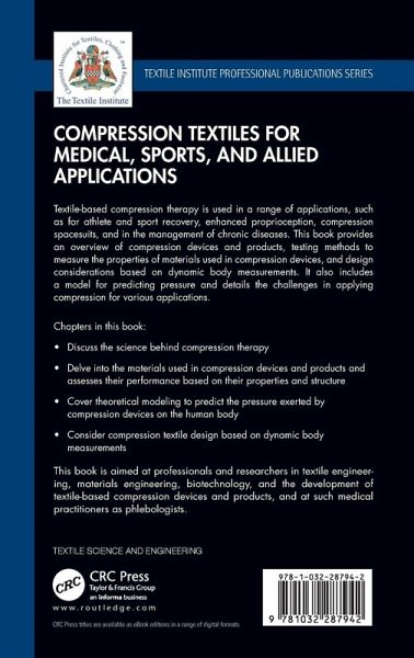 Compression Textiles for Medical, Sports, and Allied Applications provides an overview of compression devices and products. It includes testing methods to measure properties of materials, design considerations based on dynamic body measurements and a model for predicting pressure and challenges in application.