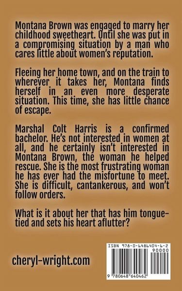 Montana Brown was engaged to marry her childhood sweetheart. Until she was put in a compromising situation by a man who cares little about women's reputation. Fleeing her home town, and on the train to wherever it takes her, Montana finds herself in an even more desperate situation. This time, she has little chance of escape. Marshal Colt Harris is a confirmed bachelor. He's not interested in women at all, and he certainly isn't interested in Montana Brown, the woman he helped rescue. She is the most frustrating woman he has ever had the misfortune to meet. She is difficult, cantankerous, and won't follow orders. What is it about her that has him tongue-tied and sets his heart aflutter?