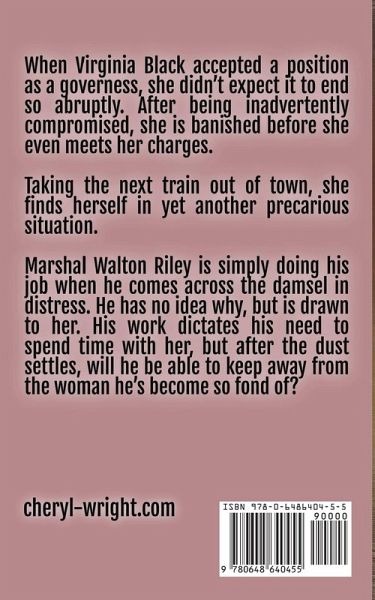 When Virginia Black accepted a position as a governess, she didn't expect it to end so abruptly. After being inadvertently compromised, she is banished before she even meets her charges. Taking the next train out of town, she finds herself in yet another precarious situation. Marshal Walton Riley is simply doing his job when he comes across the damsel in distress. He has no idea why, but is drawn to her. His work dictates his need to spend time with her, but after the dust settles, will he be able to keep away from the woman he's become so fond of?