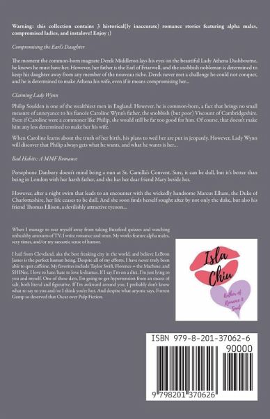 Warning: this collection contains 3 historical(ly inaccurate) romance stories featuring alpha males, compromised ladies, and instalove! Enjoy ;) Compromising the Earl's Daughter The moment the common-born magnate Derek Middleton lays his eyes on the beautiful Lady Athena Dashbourne, he knows he must have her. However, her father is the Earl of Friarwell, and the snobbish nobleman is determined to keep his daughter away from any member of the nouveau riche. Derek never met a challenge he could not conquer, and he is determined to make Athena his wife, even if it means compromising her... Claiming Lady Wynn Philip Soulden is one of the wealthiest men in England. However, he is common-born, a fact that brings no small measure of annoyance to his fiancée Caroline Wynn's father, the snobbish (but poor) Viscount of Cambridgeshire. Even if Caroline were a commoner like Philip, she would still be far too good for him. Of course, that doesn't make him any less determined to make her his wife. When Caroline learns about the truth of her birth, his plans to wed her are put in jeopardy. However, Lady Wynn will discover that Philip always gets what he wants, and what he wants is her... Bad Habits: A MMF Romance Persephone Danbury doesn't mind being a nun at St. Camilla's Convent. Sure, it can be dull, but it's better than being in London with her harsh father, and she has her dear friend Mary beside her. However, after a night swim that leads to an encounter with the wickedly handsome Marcus Elham, the Duke of Charlotteshire, her life ceases to be dull. And she soon finds herself sought after by not only the duke, but also his friend Thomas Ellison, a devilishly attractive tycoon...