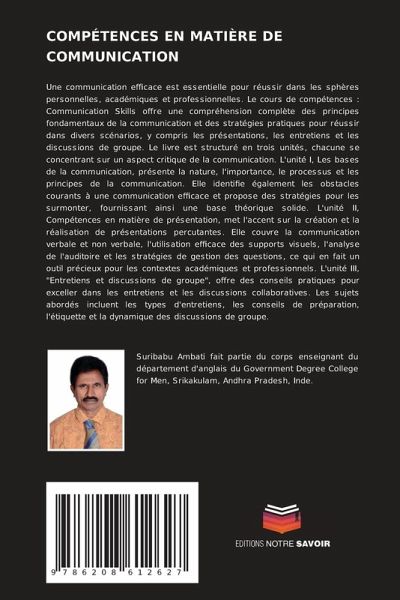 Une communication efficace est essentielle pour réussir dans les sphères personnelles, académiques et professionnelles. Le cours de compétences : Communication Skills offre une compréhension complète des principes fondamentaux de la communication et des stratégies pratiques pour réussir dans divers scénarios, y compris les présentations, les entretiens et les discussions de groupe. Le livre est structuré en trois unités, chacune se concentrant sur un aspect critique de la communication. L'unité I, Les bases de la communication, présente la nature, l'importance, le processus et les principes de la communication. Elle identifie également les obstacles courants à une communication efficace et propose des stratégies pour les surmonter, fournissant ainsi une base théorique solide. L'unité II, Compétences en matière de présentation, met l'accent sur la création et la réalisation de présentations percutantes. Elle couvre la communication verbale et non verbale, l'utilisation efficace des supports visuels, l'analyse de l'auditoire et les stratégies de gestion des questions, ce qui en fait un outil précieux pour les contextes académiques et professionnels. L'unité III, "Entretiens et discussions de groupe", offre des conseils pratiques pour exceller dans les entretiens et les discussions collaboratives. Les sujets abordés incluent les types d'entretiens, les conseils de préparation, l'étiquette et la dynamique des discussions de groupe.