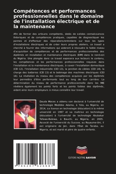 Afin de former des artisans compétents, dotés de solides connaissances théoriques et de compétences pratiques, capables de diagnostiquer les pannes et d'effectuer des réparations/entretiens sur tous les types d'installations électriques et de créer leurs propres ateliers, ce travail a cherché à fournir des informations qui aideront à résoudre le faible niveau d'acquisition de compétences et de performances professionnelles des diplômés en installation et maintenance électriques (EIM) dans le nord-est du Nigéria. Une plongée dans ce travail exposera aux lecteurs le contenu, les compétences et les performances professionnelles requises dans l'installation et la maintenance électriques, à savoir l'installation domestique (CEI 12), l'installation industrielle (CEI 13), la jonction de câbles (CEI 14), la charge des batteries (CEI 15) et le bobinage des machines électriques (CEI 16). La révélation du niveau des compétences acquises par les diplômés leur permettra d'être performants tout au long de leur carrière. La détermination du niveau de performance professionnelle dans les MIE révèlera également les points forts et les points faibles des diplômés, aidant ainsi leurs employeurs à mieux connaître leur travail.