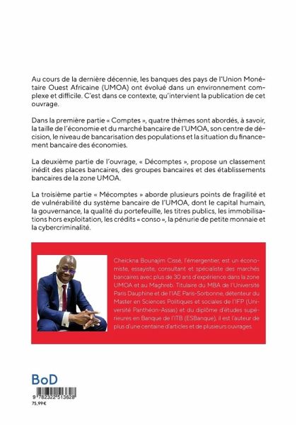 Au cours de la dernière décennie, les banques des pays de l'Union Monétaire Ouest Africaine (UMOA) ont évolué dans un environnement complexe et difficile. C¿est dans ce contexte, qüintervient la publication de cet ouvrage. Dans la première partie « Comptes », quatre thèmes sont abordés, à savoir, la taille de l¿économie et du marché bancaire de l¿UMOA, son centre de décision, le niveau de bancarisation des populations et la situation du financement bancaire des économies. La deuxième partie de l¿ouvrage, « Décomptes », propose un classement inédit des places bancaires, des groupes bancaires et des établissements bancaires de la zone UMOA. La troisième partie « Mécomptes » aborde plusieurs points de fragilité et de vulnérabilité du système bancaire de l¿UMOA, dont le capital humain, la gouvernance, la qualité du portefeuille, les titres publics, les immobilisations hors exploitation, les crédits « conso », la pénurie de petite monnaie et la cybercriminalité.