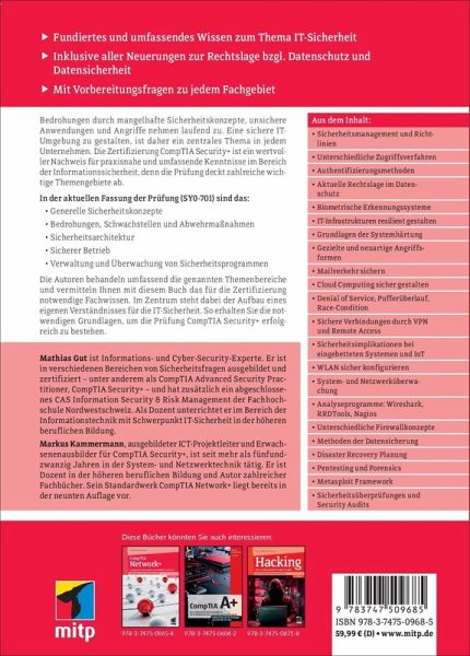 Die Autoren behandeln umfassend die genannten Themenbereiche und vermitteln Ihnen mit diesem Buch das für die Zertifizierung notwendige Fachwissen. Im Zentrum steht dabeider Aufbau eines eigenen Verständnisses für die IT-Sicherheit. So erhalten Sie die notwendigen Grundlagen, um die Prüfung CompTIA Security+ erfolgreich zu bestehen.