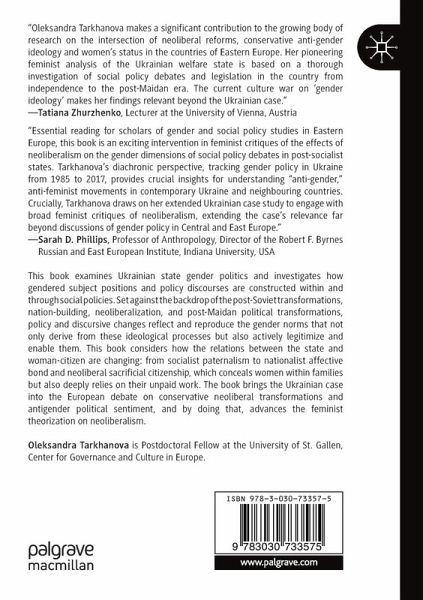 This book examines Ukrainian state gender politics and investigates how gendered subject positions and policy discourses are constructed within and through social policies. Set against the backdrop of the post-Soviet transformations, nation-building, neoliberalization, and post-Maidan political transformations, policy and discursive changes reflect and reproduce the gender norms that not only derive from these ideological processes but also actively legitimize and enable them. This book considers how the relations between the state and woman-citizen are changing: from socialist paternalism to nationalist affective bond and neoliberal sacrificial citizenship, which conceals women within families but also deeply relies on their unpaid work. The book brings the Ukrainian case into the European debate on conservative neoliberal transformations and anti-gender political sentiment, and by doing that, advances the feminist theorization on neoliberalism.