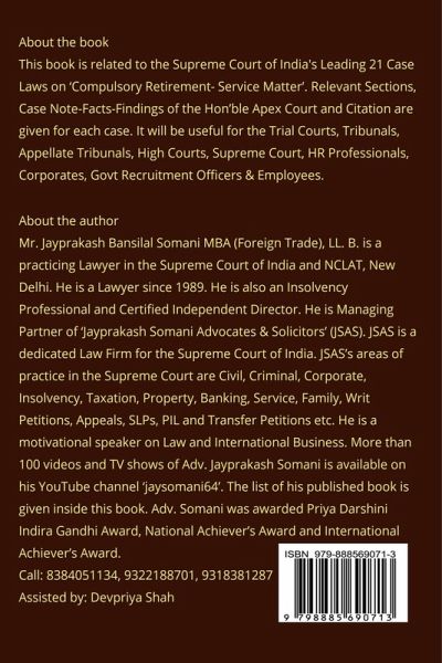 This book is related to the Supreme Court of India's Leading 21 Case Laws on 'Compulsory Retirement- Service Matter'. Relevant Sections, Case Note-Facts-Findings of the Hon'ble Apex Court and Citation are given for each case. It will be useful for the Advocates of the Trial Courts, Tribunals, Appellate Tribunals, High Courts, Supreme Court, HR Professionals, Corporates, Govt Recruitment Officers & Employees. This book is containing a synopsis of 20 leading causes of the Apex Court. Following points are given for each leading case. 1. Name of the Case i. e. Cause title 2. Relevant Sections discussed in the case 3.Hon'ble Judges/Coram of the case 4. Number of PDF Pages in Original Judgement of the case 5. All available Citations of the case 6. Case Note with appeal allowed/ dismissed or disposed off 7. Facts of the case 8.Hon'ble Apex Court's findings, while dismissing/allowing or disposing off the appeal 9. Ratio Decidendi if any. Author: Jayprakash B. Somani, Advocate Supreme Court of India Assisted by: Devpriya Shah Call: 8384051134, 9322188701, 9318381287 Website:www.jayprakashsomani.com